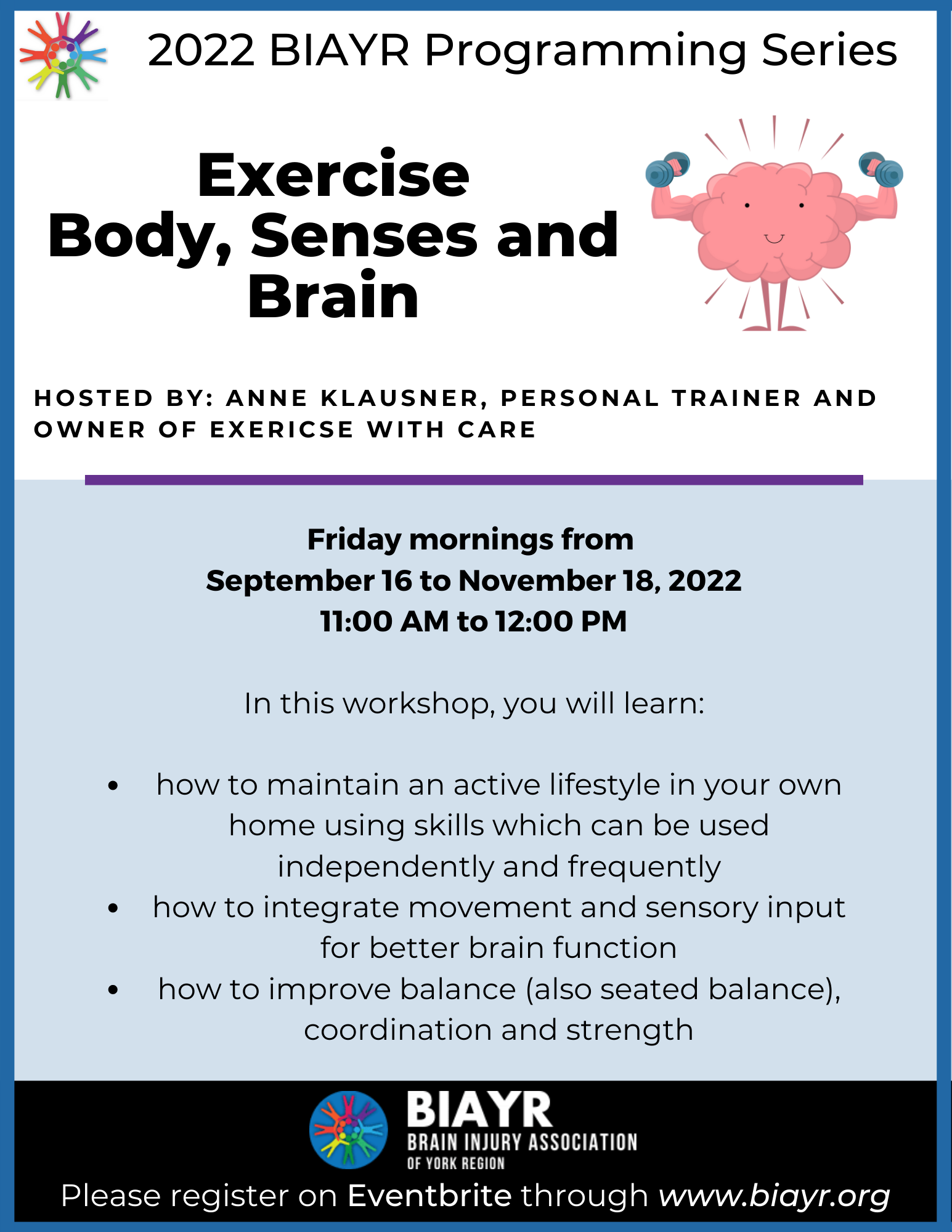 Exercise Body, Senses and Brain - 2022 BIAYR Programming Series Friday, November 4, 2022 11:00 a.m. 12:00 p.m. Google Calendar ICS Register here: https://biayr-programming-exercise-body-senses-and-brain.eventbrite.ca