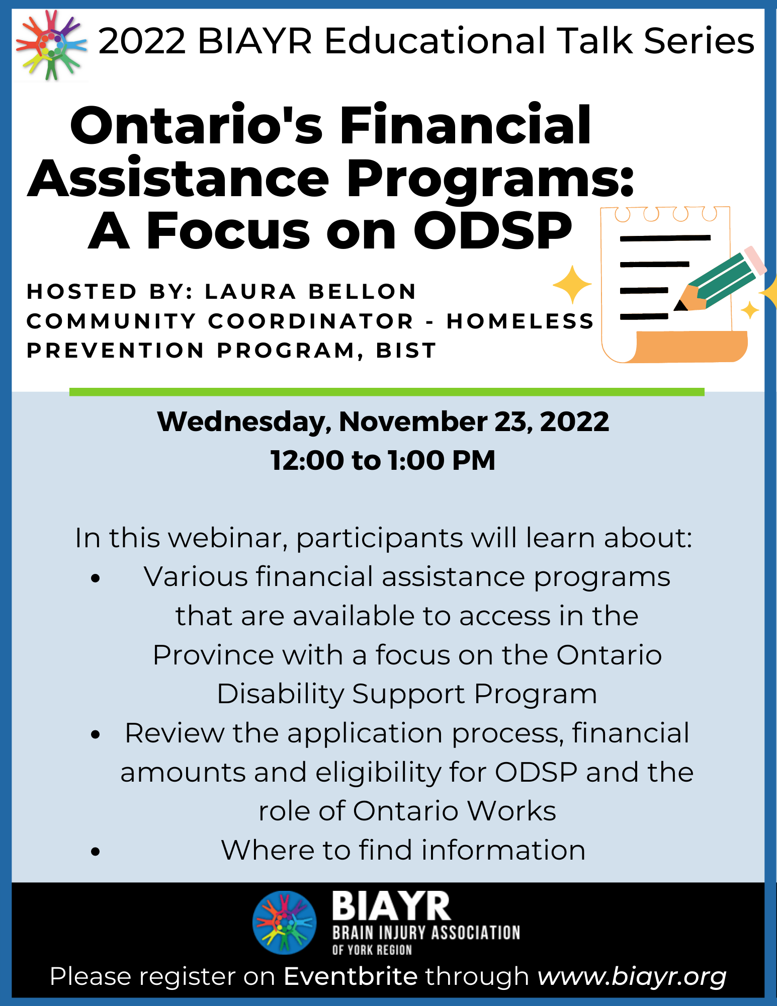 Ontario's Financial Assistance Programs - 2022 BIAYR Educational Talk Wednesday, November 23, 2022 12:00 p.m. 1:00 p.m. Google Calendar ICS Register Here: https://ontarios-financial-assistance-programs-biayr-education.eventbrite.ca